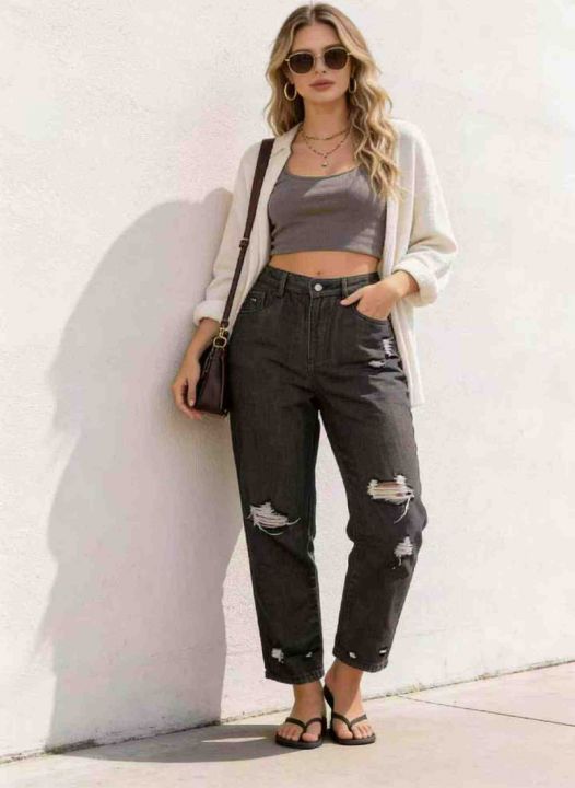 春夏季新款复古美式宽松大码女装破洞设计款牛仔老爹哈伦裤,独立包装,带腰...