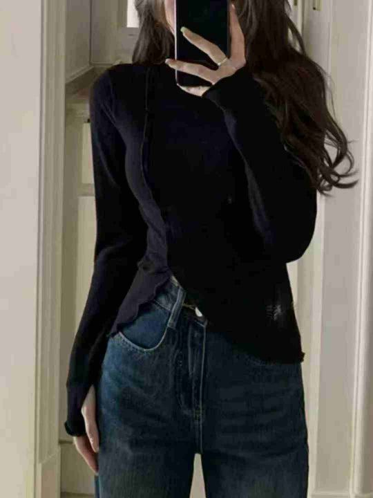 秋冬装螺纹德绒半高领T恤女设计感木耳边修身不规则百搭打底衫上衣潮,整款2色,面料软糯,弹力超大,独立包装,货品干净,1到4码,1150件左右,7.8清,分货加1。 货号:24862