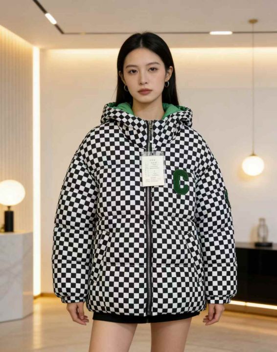全清31.8元,100件左右 羽绒棉服女装冬季,千鸟格防寒保暖印花棉袄时尚高级感棉衣,独立包装,码数M-2XL。