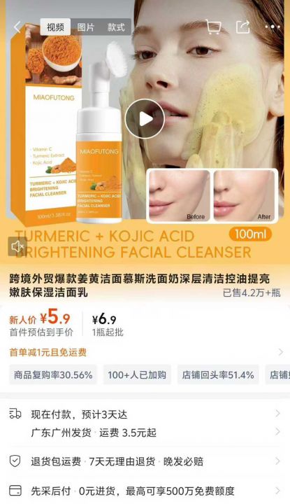 5000瓶面部清洁姜黄洁面乳独立塑封包装带有清洁刷头,容量100毫升,保质期到27年11月,全清每瓶0.8元秒!