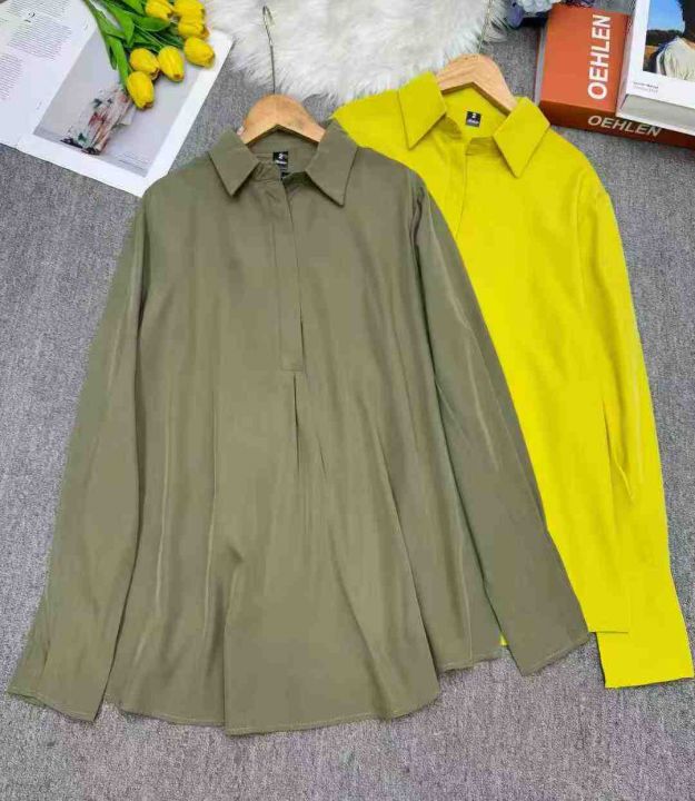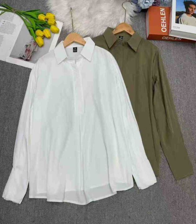 雪纺时髦翻领长袖宽松显白高级感简约风衬衣,独立包装,整款三色,码数1-6码,大货深绿为主,数量1031件,分货加1,货号112#11
