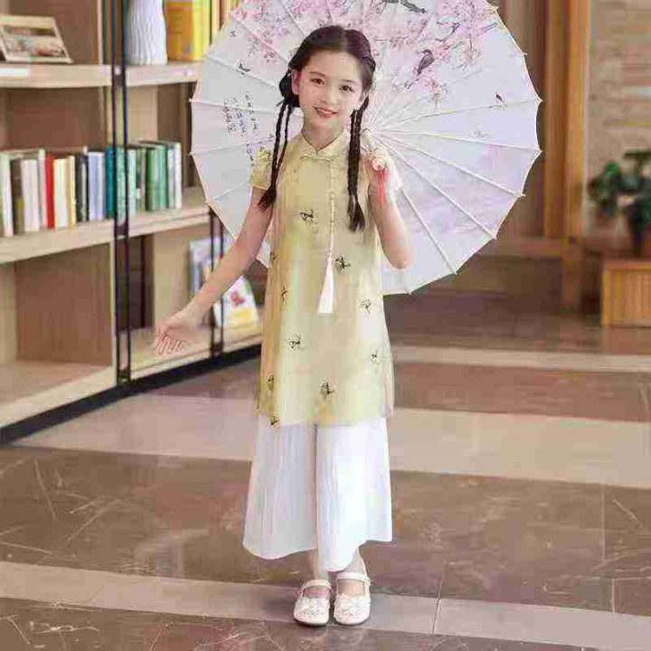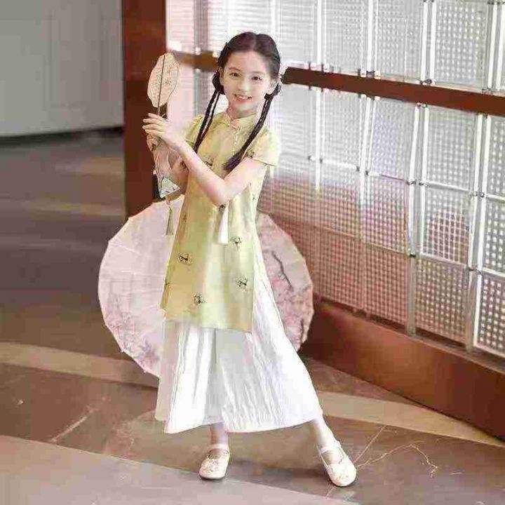 天猫在售款150套左右高品质中大童夏季新中式汉服国风阔腿裤裙两件套套装,单款两色(基本上蓝色)码数150-170,独立包装
