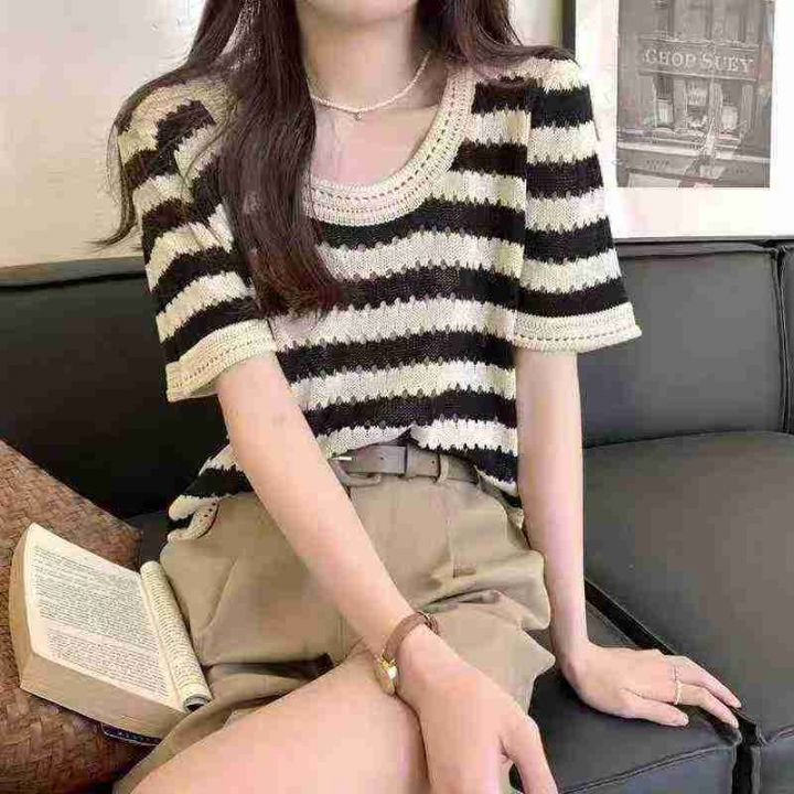 3.8清电商仓回收180件靓妹甜辣慵懒条纹针织短袖T恤,...