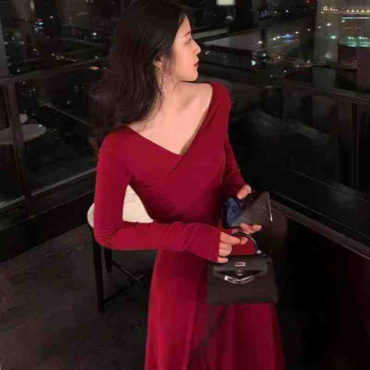 480条轻奢红色针织连衣裙女秋冬设计感别致洋气收腰打...
