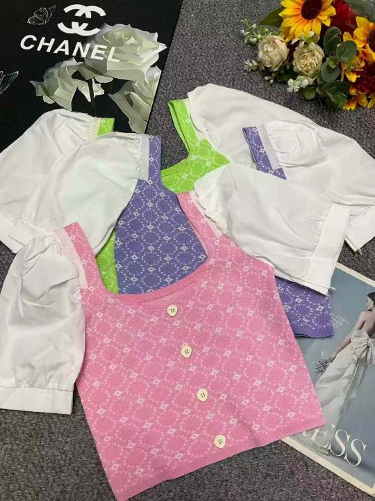 夏季新款气质港味短袖拼接泡泡袖冰丝弹力修身方领针织小衫,独立包装,均码...
