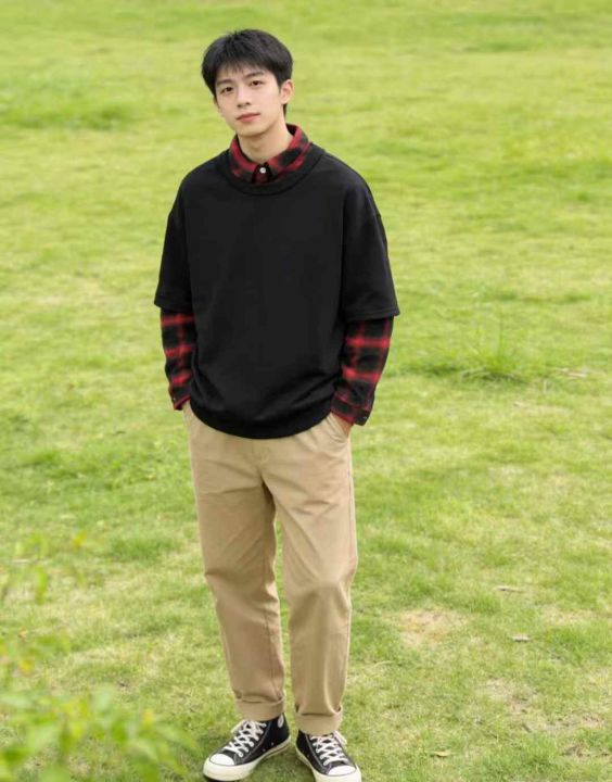 【3400件清仓】潮牌格子假两件长袖T恤▪️ 版型:宽松...
