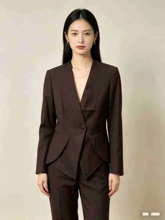 235件左右轻奢气质无领深咖色不规则下摆设计感西装,品质做工毋庸置疑,尺...