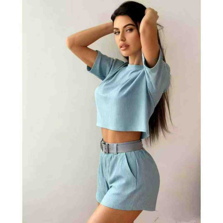 3.9清工厂回收262件外贸热卖设计感时尚套装雾霾蓝短袖...