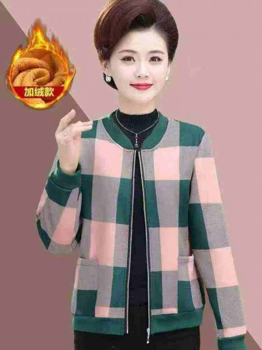 妈妈装圆领拉链夹克开衫春秋款,百搭格子款外套,加绒...