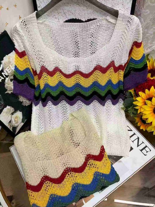 夏季新款彩虹条纹镂空冰丝宽松洋气减龄短款短袖针织小...