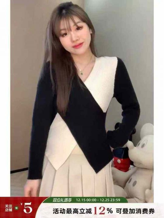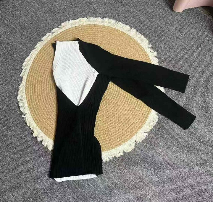 秋冬穿搭黑色不规则修身拼色针织衫毛衣女款2025新款打...