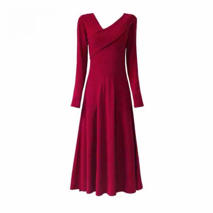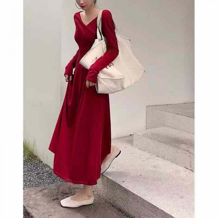480条轻奢红色针织连衣裙女秋冬设计感别致洋气收腰打...