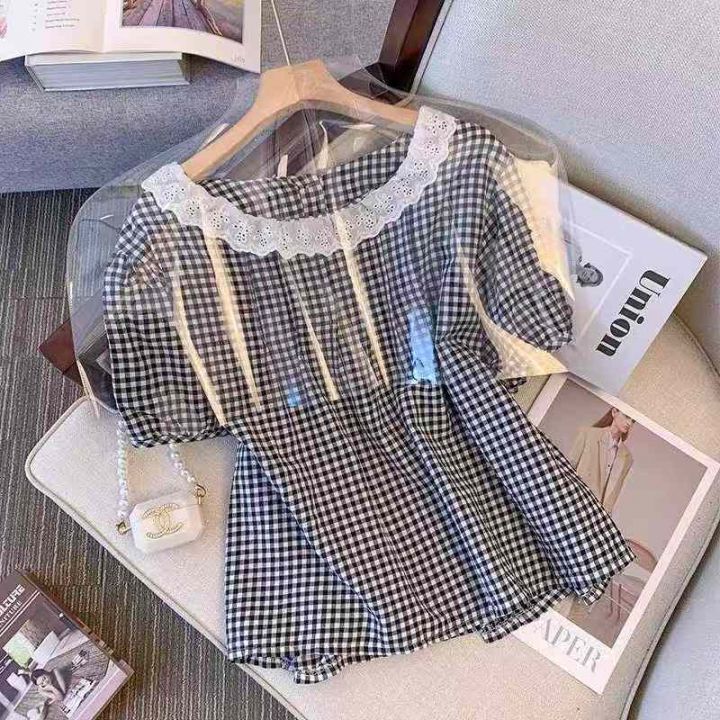 ☕️娃娃领短袖衬衫女夏季花边蕾丝格子衬衣宽松显瘦法式上衣220件全清7.8元...
