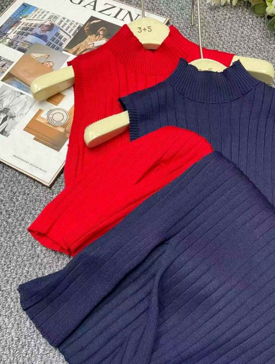 春夏季新款法式复古高弹力修身显瘦半高领坑条开叉设计...