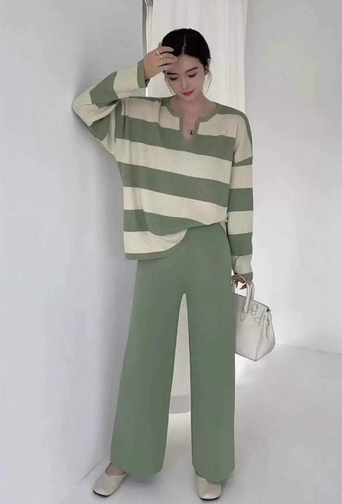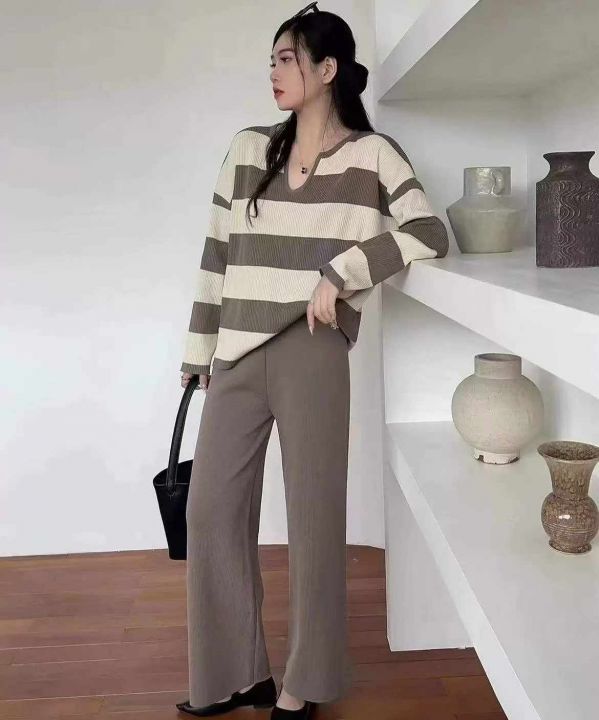 秋冬新款时尚洋气显瘦韩版宽松微胖MM撞色条纹针织套头...