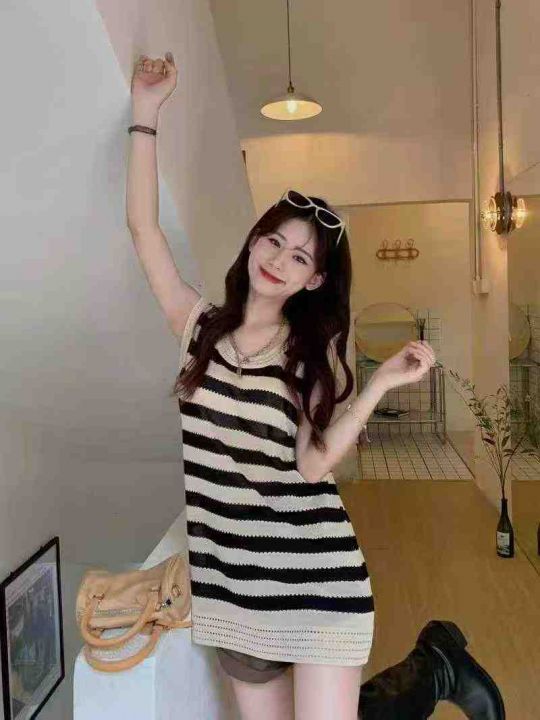 5.9元清仓!条纹针织宽松显瘦镂空设计感无袖连衣裙...