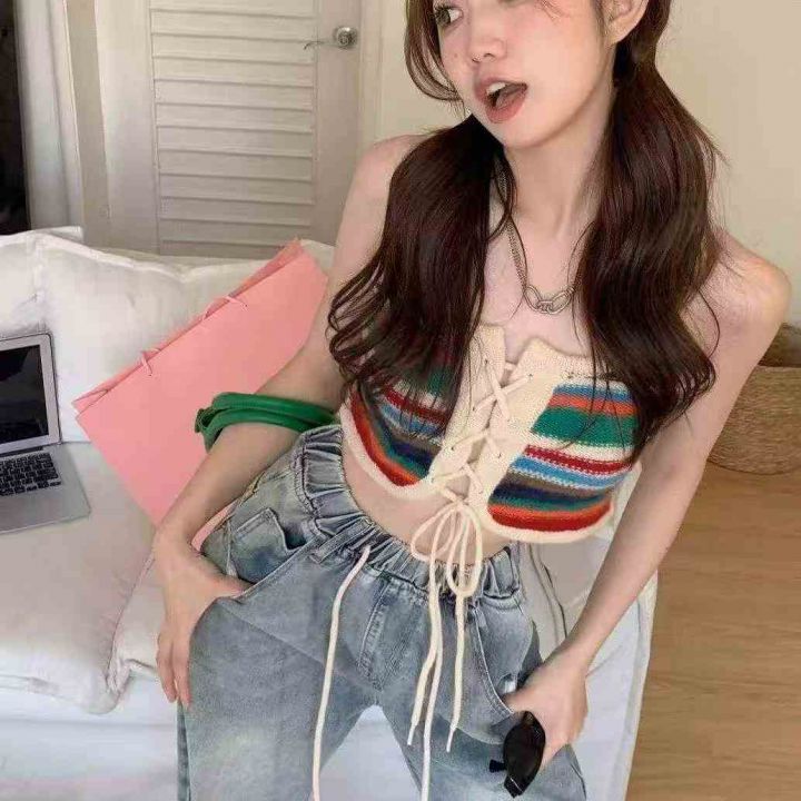 夏季新款辣妹性感纯欲风设计感抽绳绑带彩虹条纹针织吊...