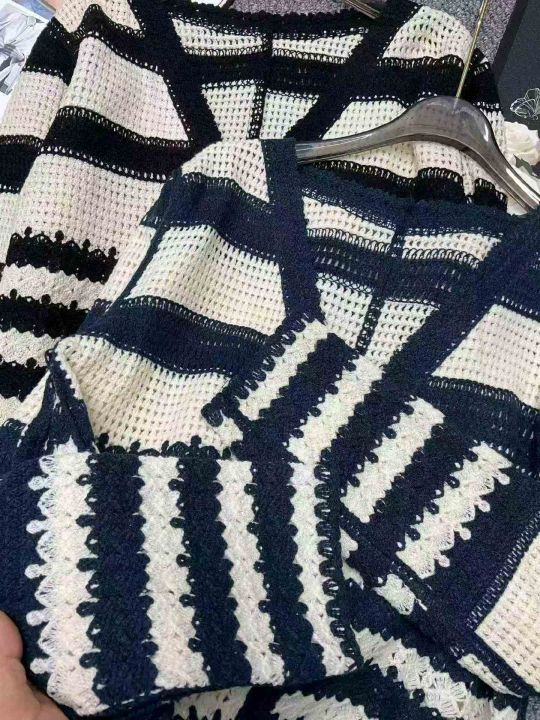 春秋新款法式复古撞色条纹宽松镂空针织毛衣开衫+针织...