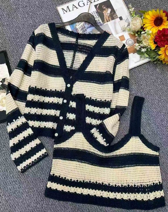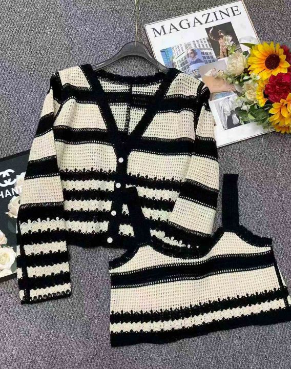 春秋新款法式复古撞色条纹宽松镂空针织毛衣开衫+针织条纹吊带背心2件套,独立包装,均码面料柔软舒适,240套左右,全清9.9元超低价秒杀!分货加一!