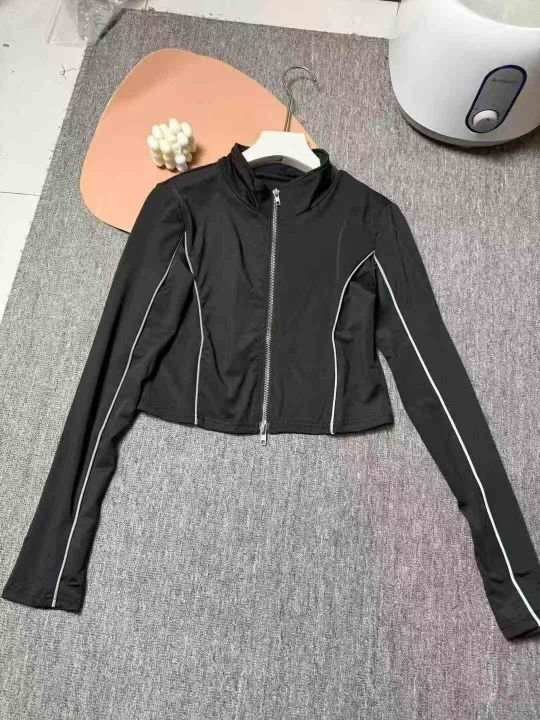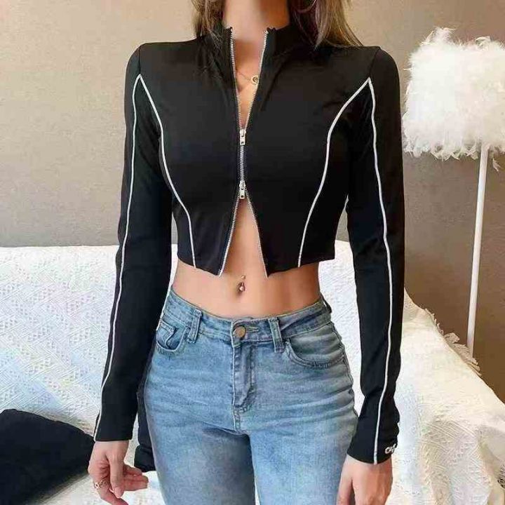8.9清245件设计感双向拉链短款长袖上衣T恤外套女2025春秋新款修身显瘦高弹塑形长袖小衫 码数S-M-L 独立包装