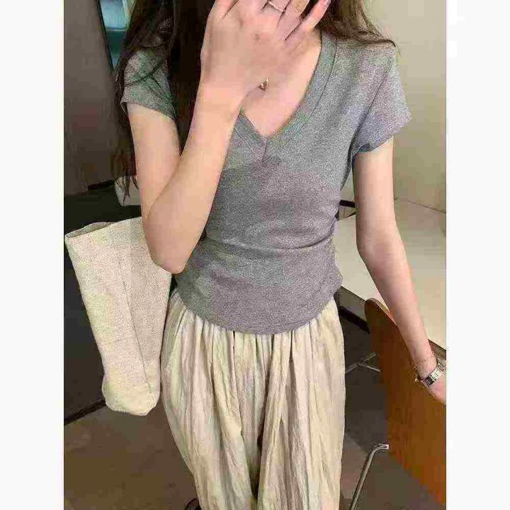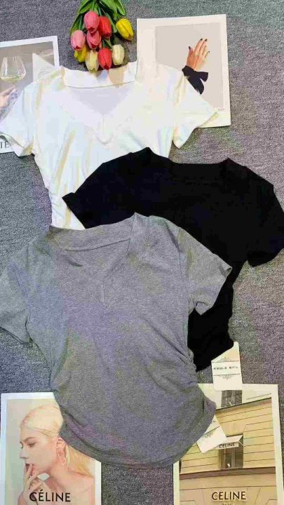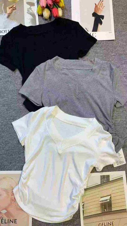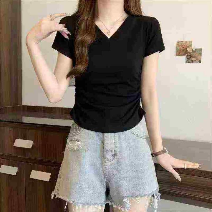 韩版V领纯色正肩褶皱收腰设计感辣妹T恤,[爱心]110件左右,白色为主,款号#1011,码数S-XL,穿70-120斤,万佳档口货,原包装️无瑕疵,[666]实体店品质