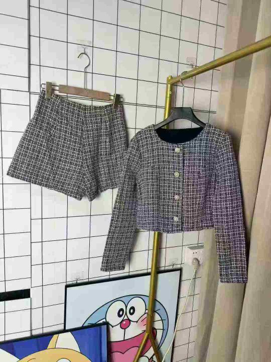 18.8清170套女装小香风外套短裤 两件套 复古圆领长袖格纹小香风粗花呢外套高腰短裤套装 码数XS- L 独立拉链包装