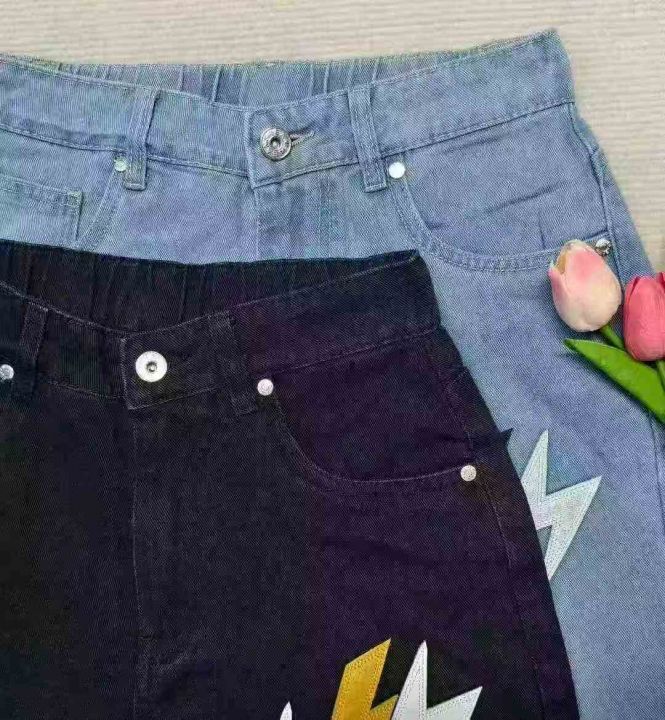 水洗棉直简微喇叭长裤松紧腰美式潮牌宽松闪电皮刺绣牛仔裤,488件,S-2XL,男女同款,独立包装,全清13.8元,分货+0.5
