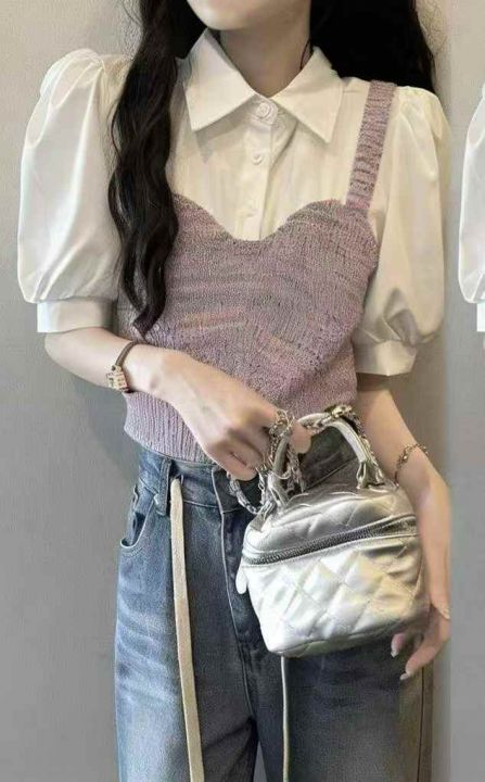夏季新款设计感小众假两件拼接polo领法式泡泡短袖衬衫...