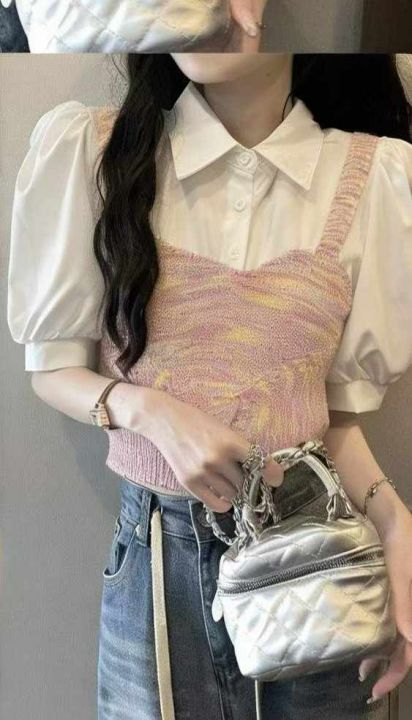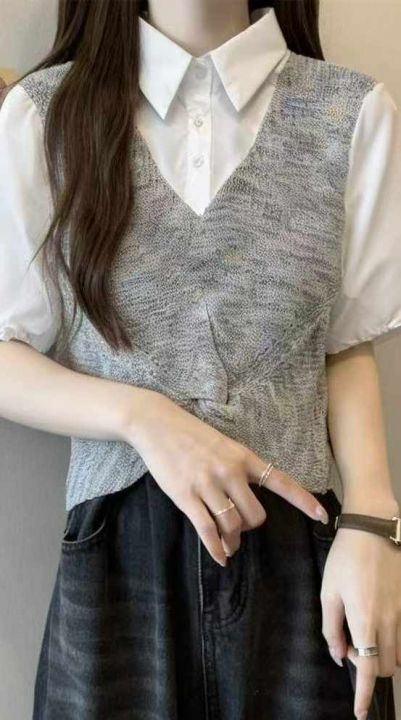 夏季新款设计感小众假两件拼接polo领法式泡泡短袖衬衫...