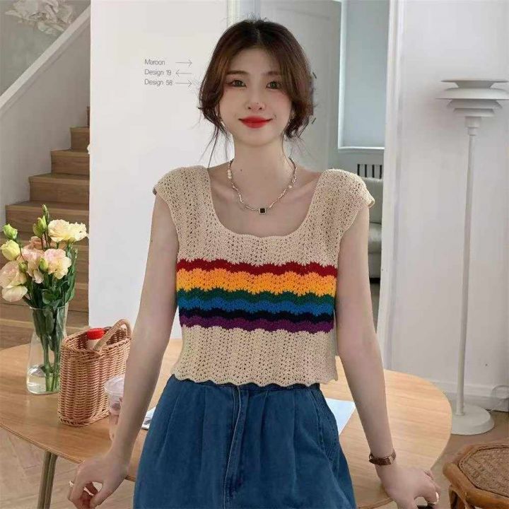 夏季新款彩虹镂空网红设计感短款冰丝宽松针织吊带背心...