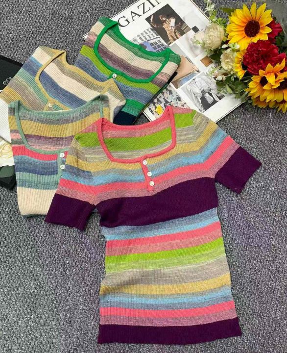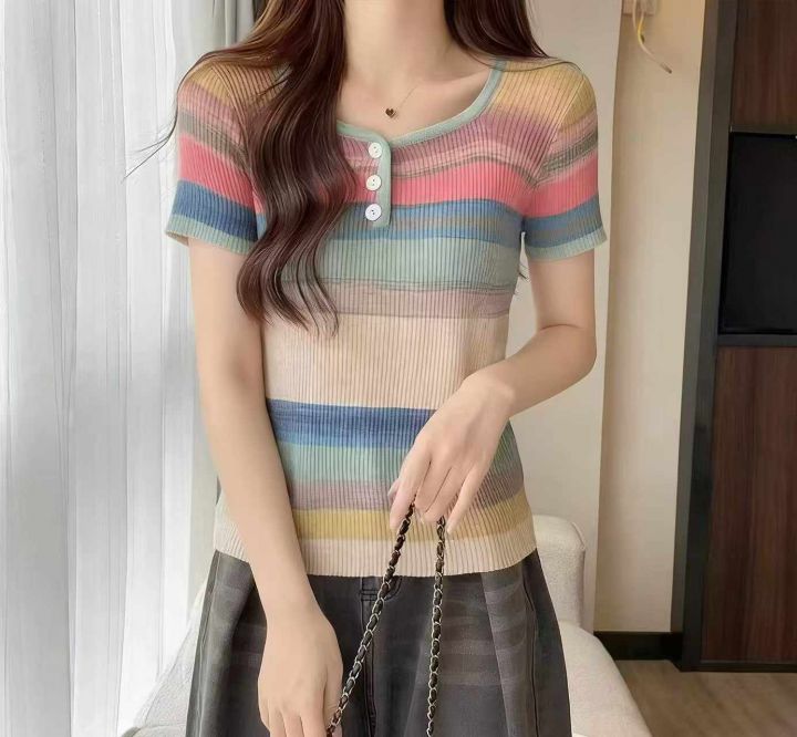 夏季新款弹力修身显瘦撞色彩虹条纹针织短袖T桖,独立包装,均码面料软糯舒适弹力大,740件,全清5.9元超低价秒杀!分货加一!