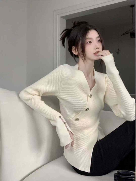 不规则v领针织衫女秋冬设计感小众毛衣开叉修身上衣潮...