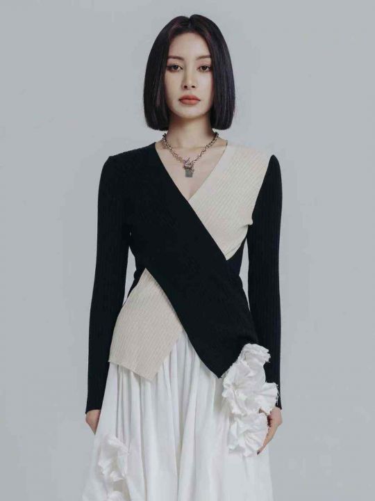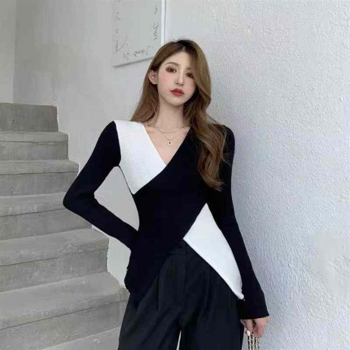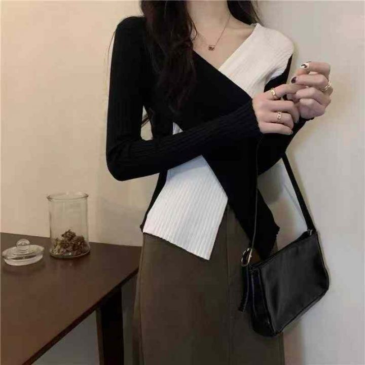 秋冬穿搭黑色不规则修身拼色针织衫毛衣女款2025新款打...