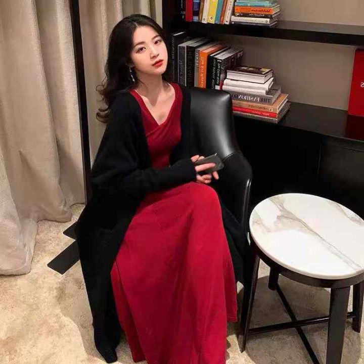 480条轻奢红色针织连衣裙女秋冬设计感别致洋气收腰打...