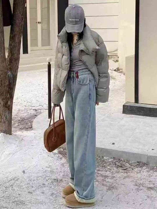 冬季新款网红复古蓝刺绣设计款加绒加厚直筒阔腿牛仔裤...