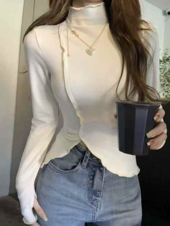 秋冬装螺纹德绒半高领T恤女设计感木耳边修身不规则百搭打底衫上衣潮,整款2色,面料软糯,弹力超大,独立包装,货品干净,1到4码,1150件左右,7.8清,分货加1