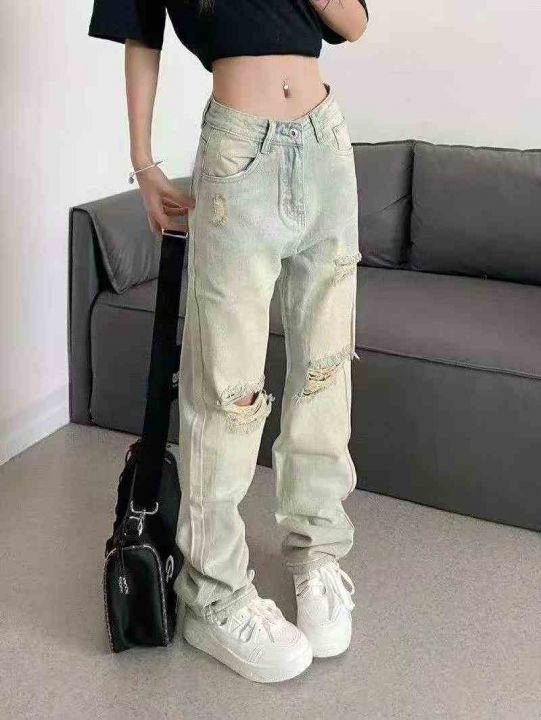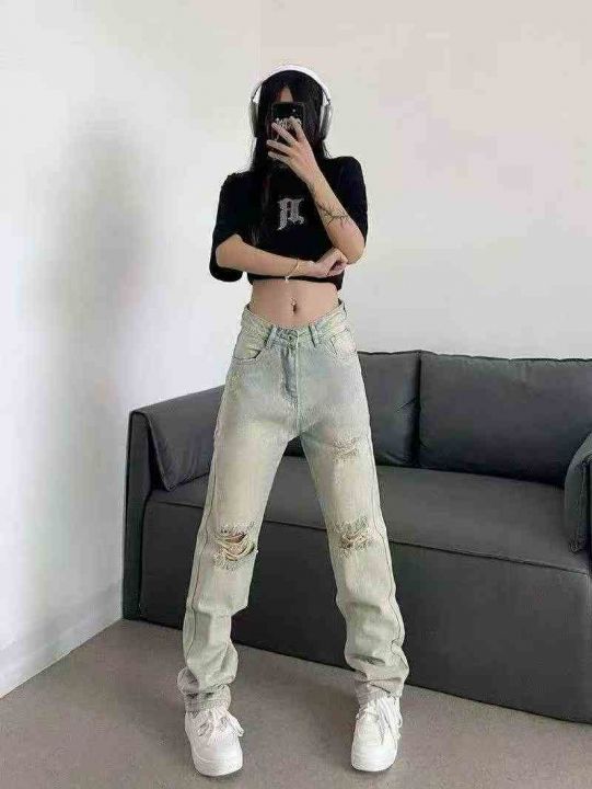 春秋新款高弹力洗水棉网红复古黄泥色牛仔直筒裤,独立...