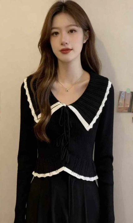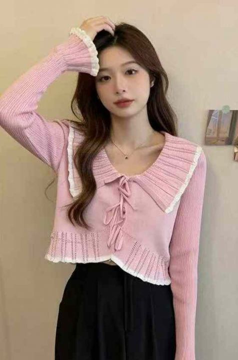 春秋新款时尚娃娃领绑绳设计款慵懒风宽松针织毛衣开衫...