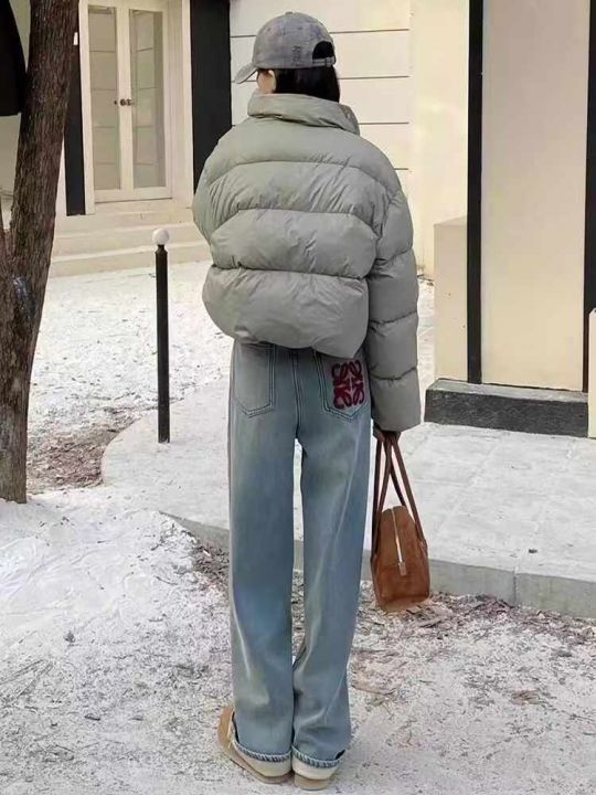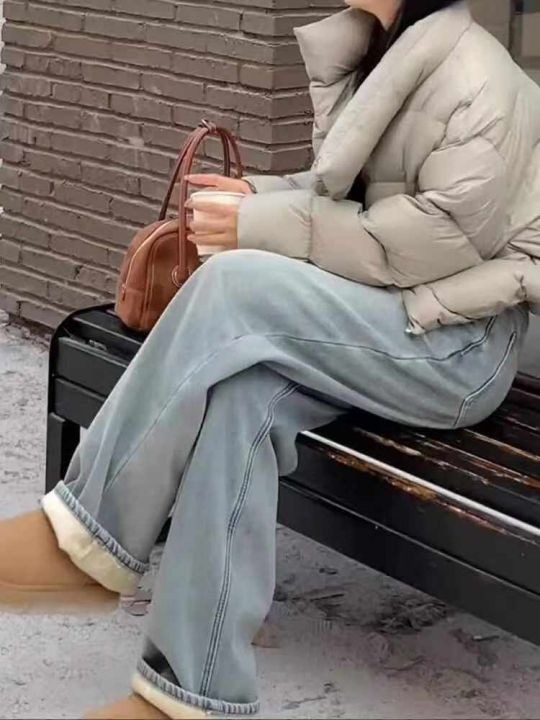 冬季新款网红复古蓝刺绣设计款加绒加厚直筒阔腿牛仔裤...