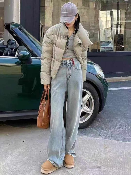 冬季新款网红复古蓝刺绣设计款加绒加厚直筒阔腿牛仔裤...