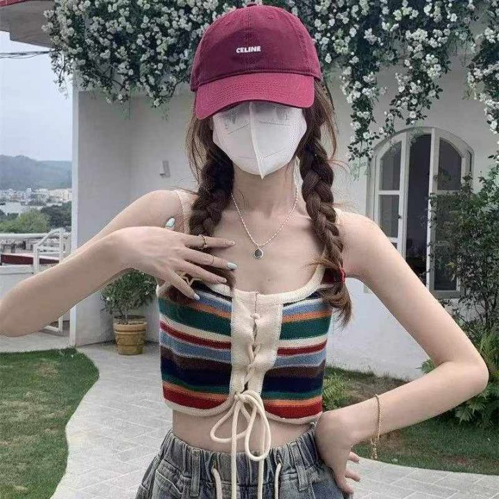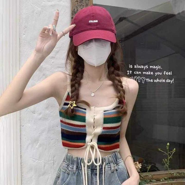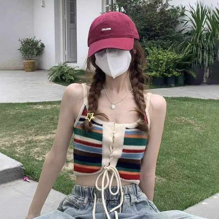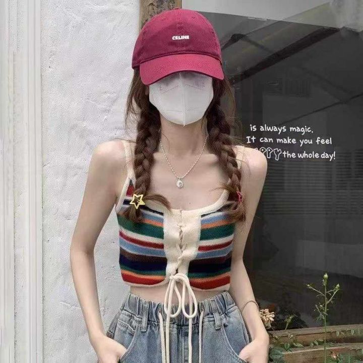 夏季新款辣妹性感纯欲风设计感抽绳绑带彩虹条纹针织吊...