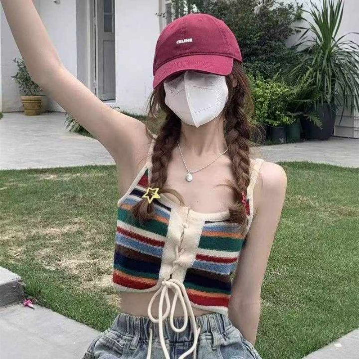 夏季新款辣妹性感纯欲风设计感抽绳绑带彩虹条纹针织吊...