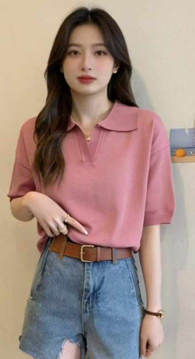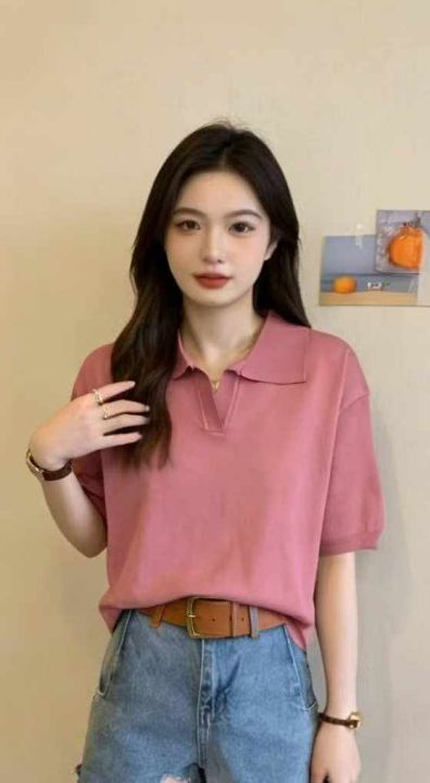 夏季薄款温柔风百搭翻领韩系宽松净版百搭短袖针织衫,...