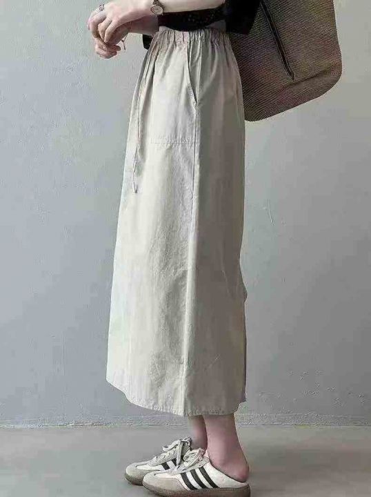 韩系新款复古高腰双口袋工装半身裙绑带松紧宽松A字裙休闲半身裙,高品质尼龙锦纶面料,独立包装
