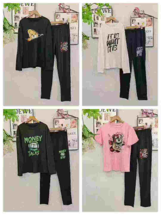 数量13200套,码数S一5XL,190克牛奶丝磨毛面料,面料柔软高弹力,全部独立包装,有长裤长袖套装,有长裤短袖套装,有短袖短裤套装,图案多,整杂图案,500起分货➕1