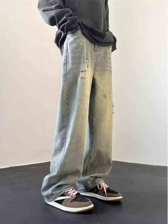 春秋新款男女同款复古蓝破洞设计款牛仔裤,独立包装带...