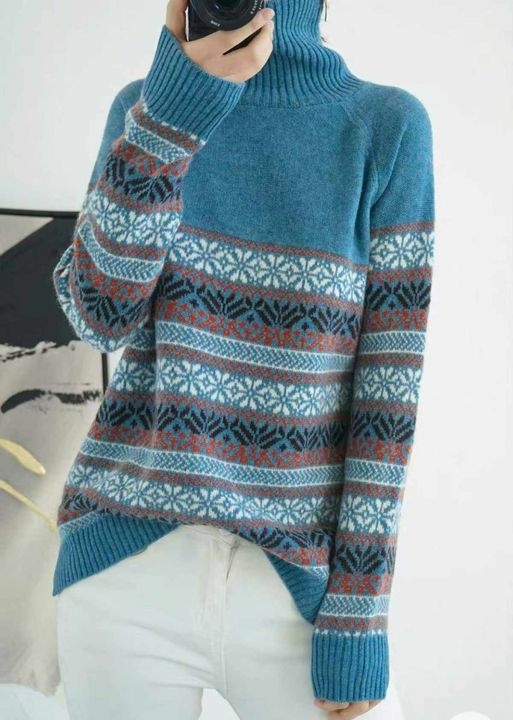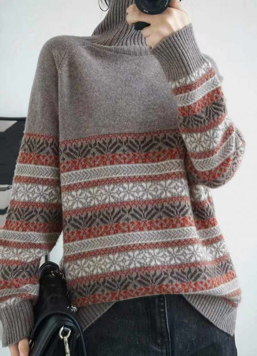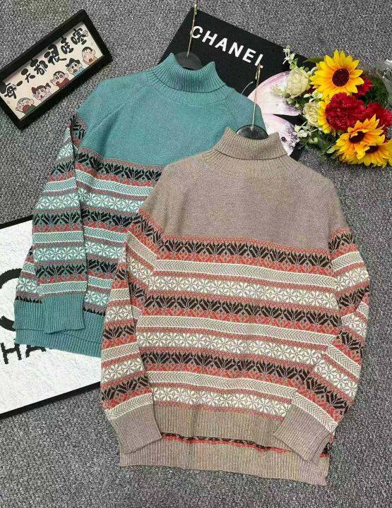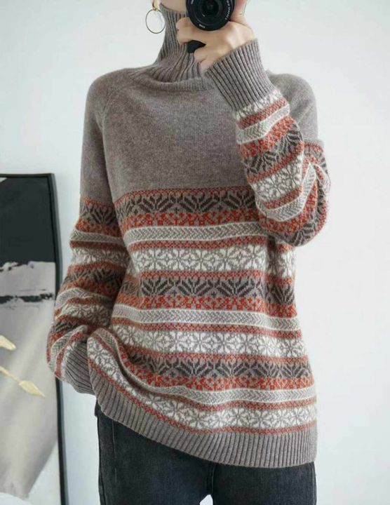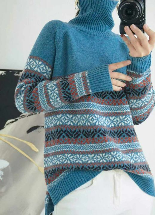 秋冬新款高领提花复古宽松微胖MM韩系慵懒风加厚套头毛...