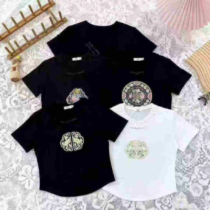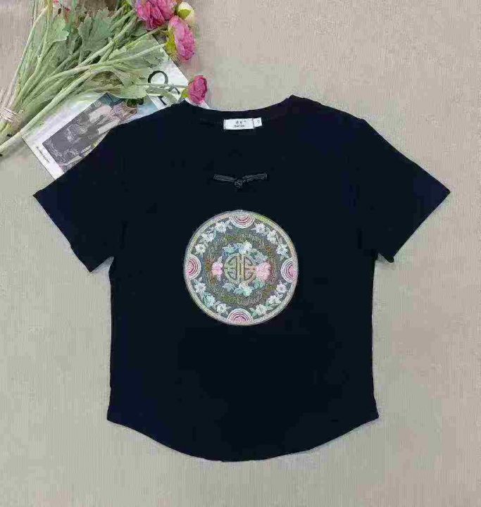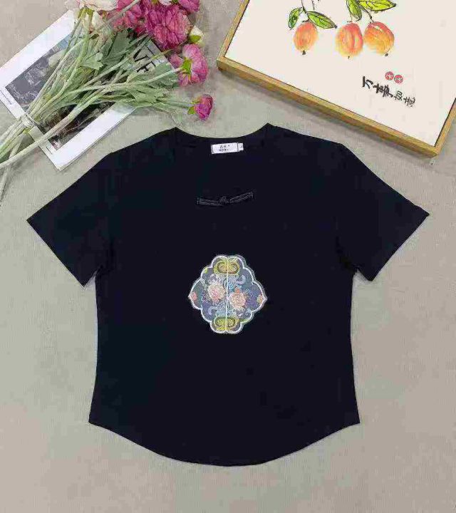 1625件国风重工刺绣中式盘扣拉架棉短袖T恤女,以黑色...