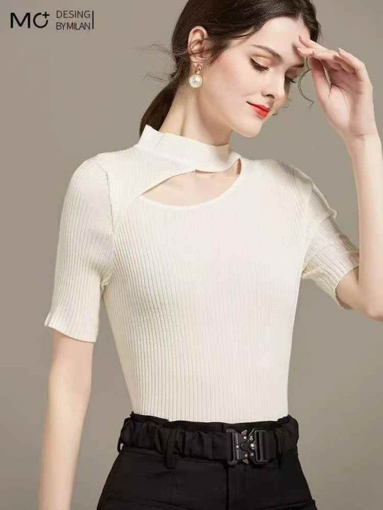 夏季新款时尚心机挂肩挖空露锁骨短袖针织小衫,独立包装,均码面料柔软舒适...