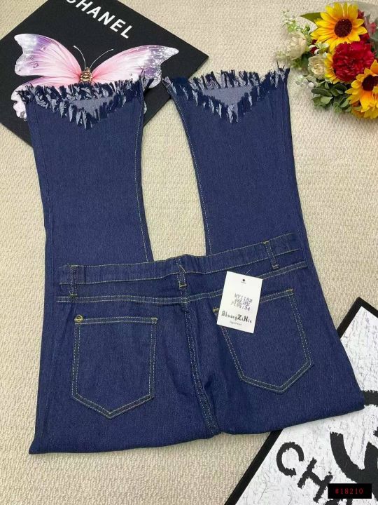 春夏季新款大码女装高腰弹力修身垂感流苏九分牛仔喇叭裤,独立包装带吊牌,...